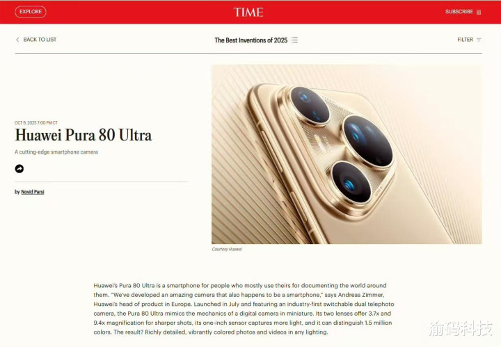 HUAWEI Pura 80 Ultra 成功入选,被《时代》周刊评价为将“专业相机理念融入手机”,彻底重新定义了移动摄影的边界。